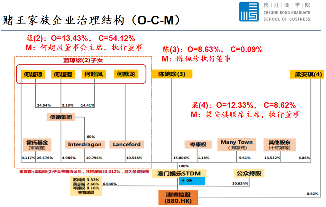上圖是賭王家族的企業(yè)治理結(jié)構(gòu),能看出澳博控股的所有權(quán)(O)和控制權(quán)(C)都基本被家族掌握。
