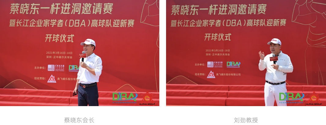 開球儀式上,在參賽隊員、嘉賓的祝福聲中,企業家學者項目五期班同學、長江商學院廣東校友會聯席會長蔡曉東,長江商學院DBA項目副院長、會計與金融學教授劉勁致辭帶動歡樂的氣氛,企業家學者項目五期班同學、長江企業家學者高球隊華南區隊長張斌及各地區隊長也到場共同為賽事揮桿,吹響賽事的號角。