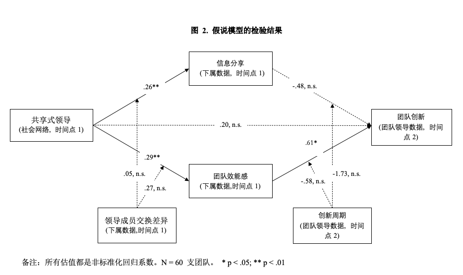 正如預(yù)期的那樣,共享式領(lǐng)導(dǎo)與信息分享和團(tuán)隊(duì)效能感呈正相關(guān)。雖然團(tuán)隊(duì)創(chuàng)新與共享式領(lǐng)導(dǎo)和團(tuán)隊(duì)效能感沒(méi)有顯著相關(guān),但這兩個(gè)變量都與團(tuán)隊(duì)創(chuàng)新具有正向關(guān)系。