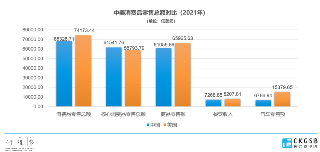 消費(fèi)大數(shù)據(jù)折射中國(guó)經(jīng)濟(jì)轉(zhuǎn)型升級(jí)的軌跡。近年來(lái)中國(guó)消費(fèi)市場(chǎng)逐漸呈現(xiàn)出消費(fèi)升級(jí)和國(guó)貨崛起的趨勢(shì)。2021年,中國(guó)消費(fèi)品零售總額約為美國(guó)的92%,其中核心消費(fèi)品零售總額已經(jīng)超過(guò)美國(guó),中國(guó)有望成為世界最大的單一消費(fèi)市場(chǎng)。