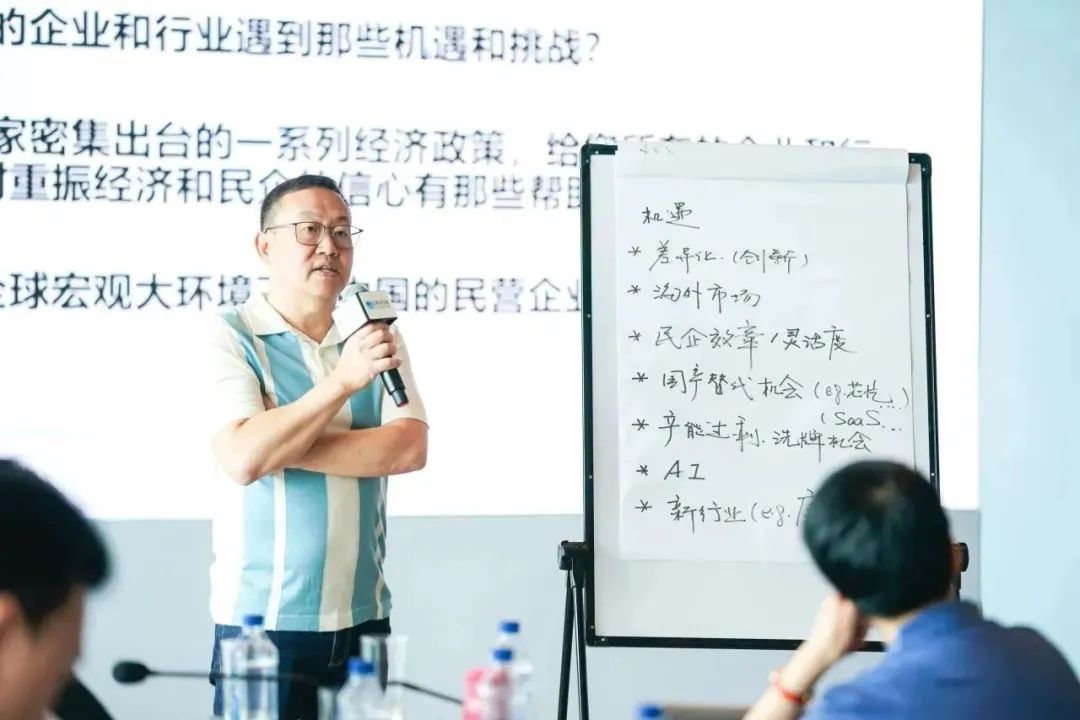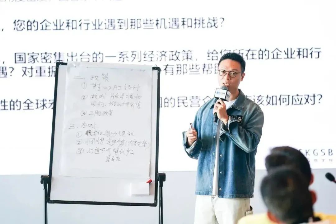 十班同學中有三分之一從事數字經濟、AI以及商業服務,這部分同學被劃分入從事實體的研習小組中,以期在不同主題的研習小組中產生深度的協同和整合,即使在無課期間,也可以在老師的帶領下,走進組內同學企業,深入展開主題行業研究及私董會,教學相長,深入商業實踐。