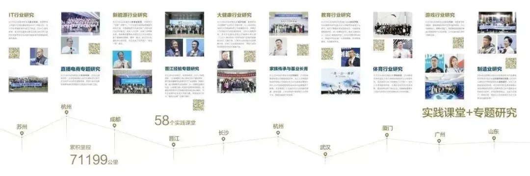 作為長江DBA的特色學習方式之一,在DBA核心課程體系的基礎上,實踐課堂+行業洞見系列貫穿課程每個模塊。十年間,DBA項目共開啟58個實踐課堂,以教授及DBA研究團隊全視角研究為鋪墊,提供框架思考,足跡遍布20多個城市,累計里程超7萬公里。