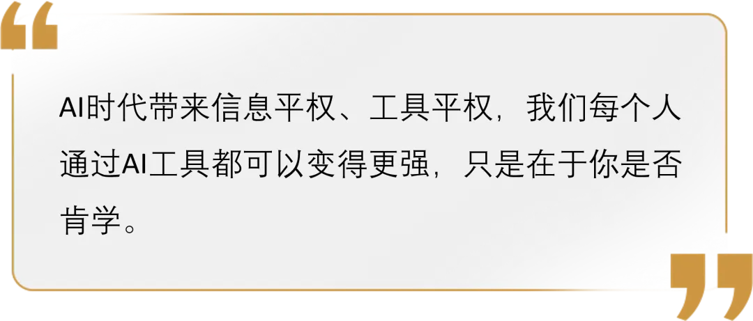 “AI時代帶來信息平權、工具平權,我們每個人通過AI工具都可以變得更強,只是在于你是否肯學。”