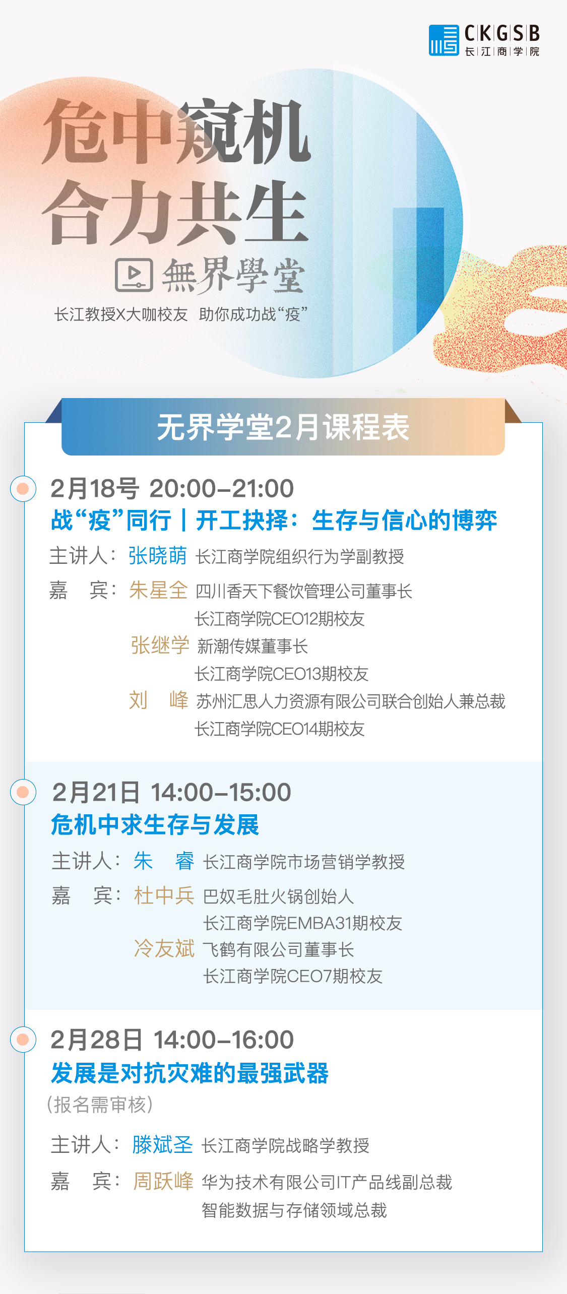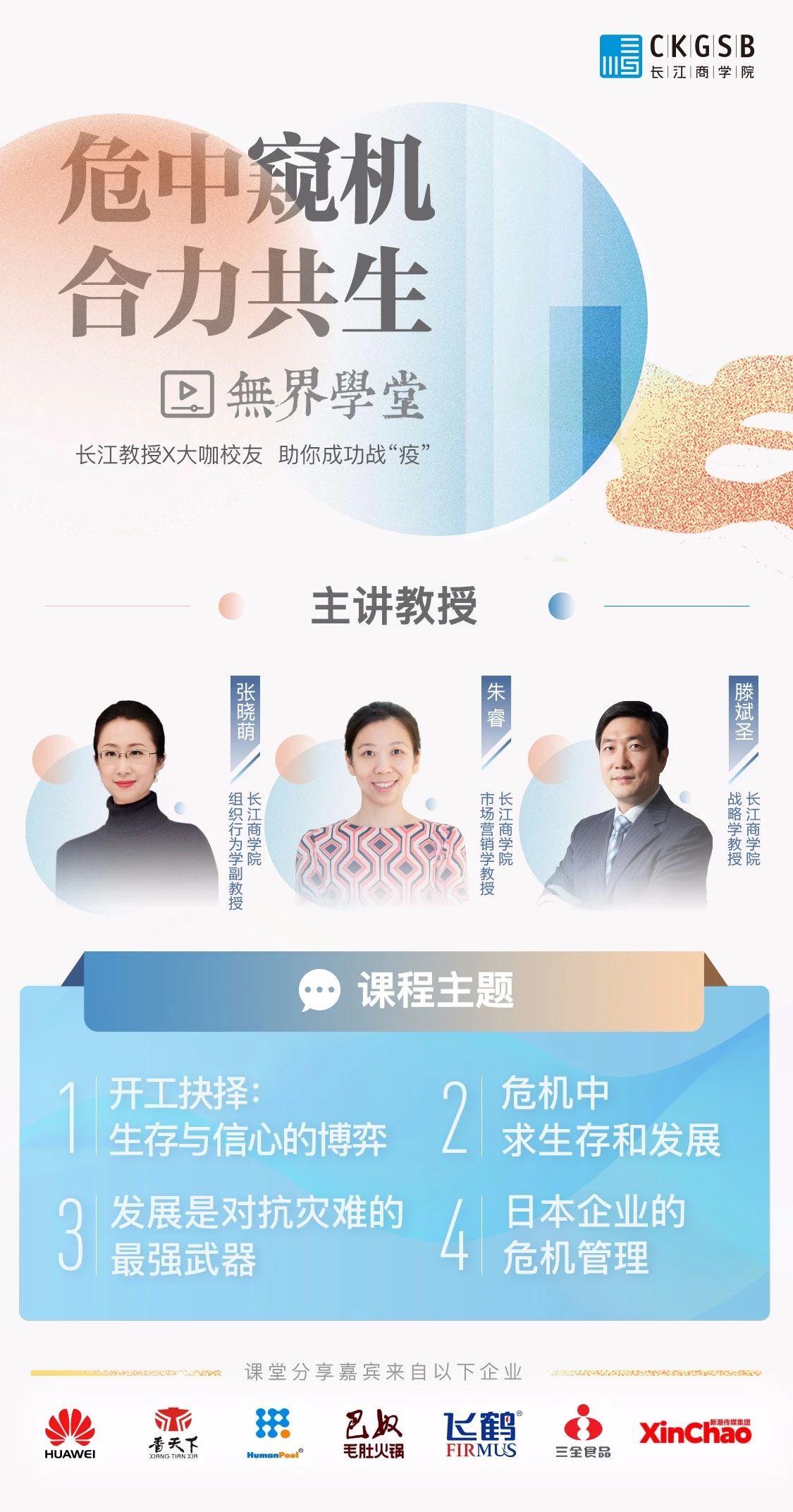 长江商学院EMBA&EE联合推出“长江商学院无界学堂”,该课程为免费在线课程,由长江教授主讲,联合长江大咖校友,结合理论与实践,从宏观到微观,从疫情影响下的经济到每个企业具体的决策,层层剖析,赋能更多中国企业家。