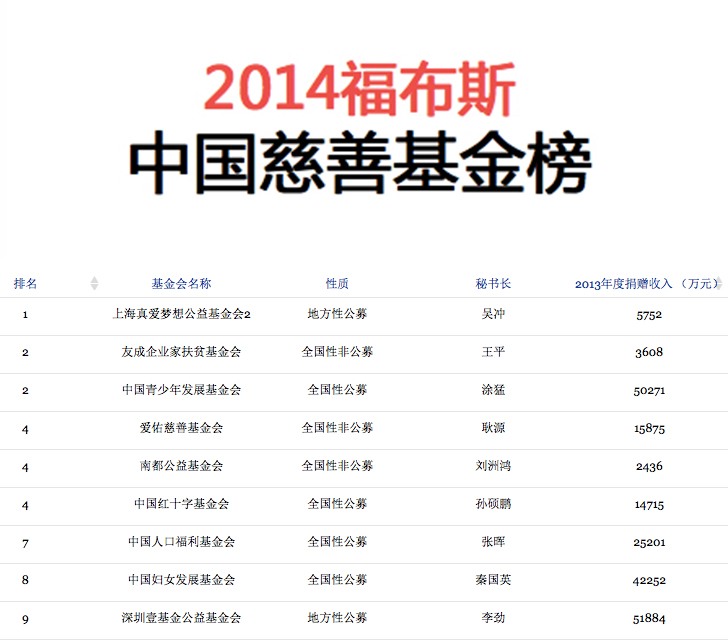 福布斯中文版推出“2014年中国慈善基金榜”,上海真爱梦想公益基金会连续第四年名列第一,而一些基金会在透明度管理方面获得长足进步,友成企业家扶贫基金会和中国青少年发展基金会并列第二。