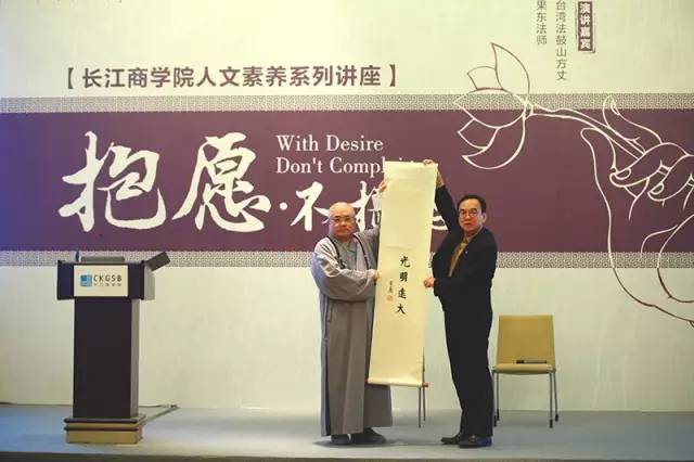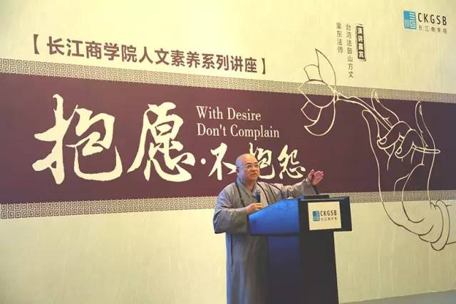 11月21日晚,台湾中国佛教会副理事长、法鼓山方丈、法鼓山僧伽大学校长果东法师做客长江人文系列讲座,用深入浅出的如珠妙语为长江EMBA27期新生带来他对于职场、家庭、人生方方面面的精彩解读,告诉我们如何做到抱愿,不抱怨。