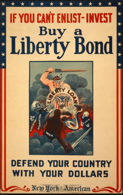 在第一次世界大战期间,世界上很多国家都通过战争债券(War Bond)的形式进行融资。美国发行的债券名称叫做自由债券(Liberty Bonds)。当时流行的一句广告词是:“如果你不能参军打仗的话,请购买自由债券(If you can’t enlist, invest. Buy a liberty bond)”。著名的喜剧大师卓别林先生还自导自演了一部短片“The Bond”(Bond在英文中的另外一个意思是纽带)来宣传和推广战争债。美国的第一批自由债在1917年发行,以票面利率3.5%筹集了50亿美金。第二次世界大战期间,战争债再次发行。到目前为止在英国,为一战融资的永续债券(Consols)仍有部分在市面上流通。