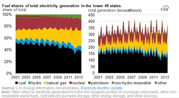 在过去的30年里,美国的空气污染物降低了一半以上,同时,工业生产总值却提高了约40%。著名的迈克尔波特教授(Michael Porter)一直宣扬这样的观点:“严厉的环境保护法规会促进企业不断的创新和升级,并提高生产率”,这也被称为“Porter Hypothesis”。下图中,这些年来的核能和天然气在发电中的广泛应用可视为证据。