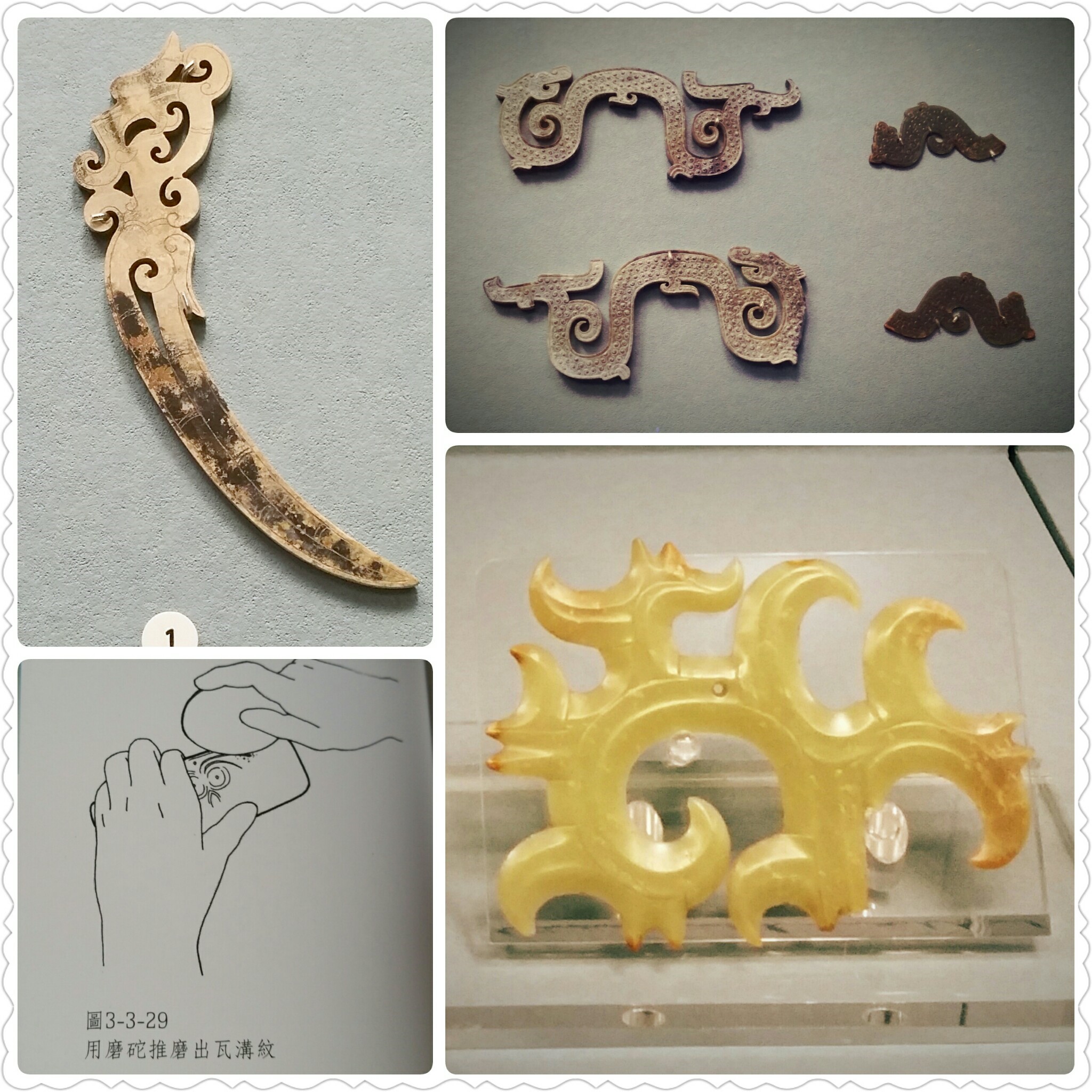 如果不是听过蔡老师的课,上图这些玉做的“羽纹”,和我们应该永远无缘认识。以下这些都是羽纹形式的演进,代表着玉在中国人历史及心中的演进:玉之灵、玉之德、玉之巧、玉之华,也就是说玉一开始不是庶民可亲的,是拿来敬天地的,之后是来尊帝王的,逐渐的大家注意到玉的美及妆饰性,至今,玉已经走入我们的生活中了。