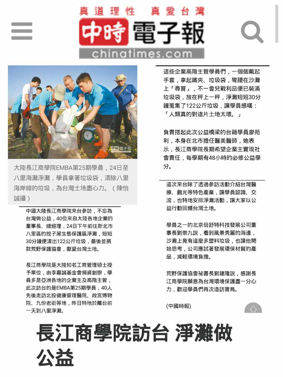 这次活动也让台湾媒体及荒野保护协会的朋友们觉得很感动,因为长江人都是赫赫有名的企业领导老板,却愿意在旅游行程里面,花出时间尽心尽力来为台湾海岸线的保护尽一己心力。