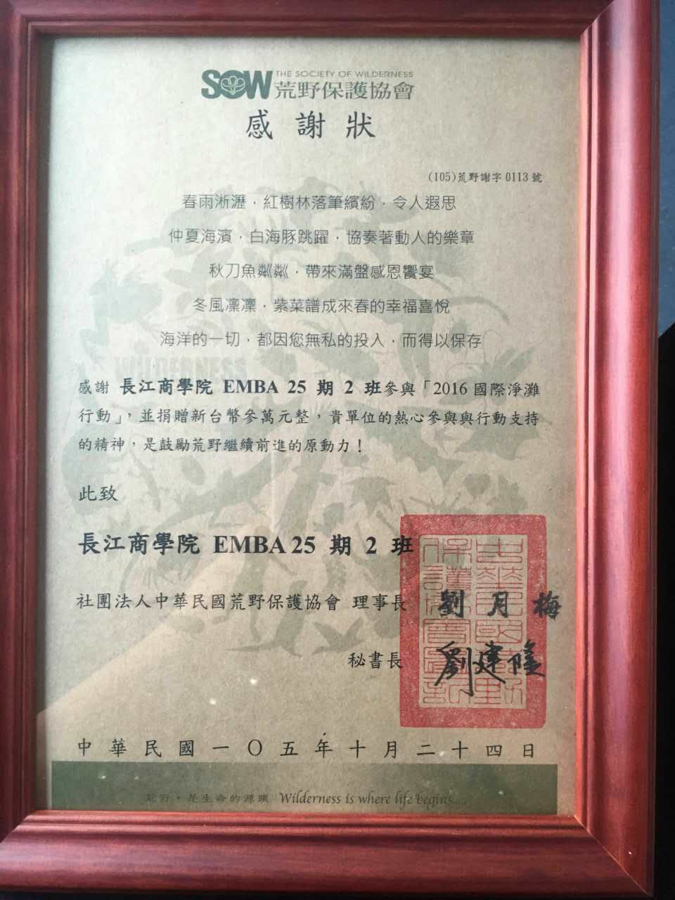 最后,以荒野保护协会给我们的感谢奖牌结尾,那一年,我们一起在台北,我们走过、我们爱过、我们笑过;我们一起学习,我们共同付出。长江EMBA25期小二们,爱大家!