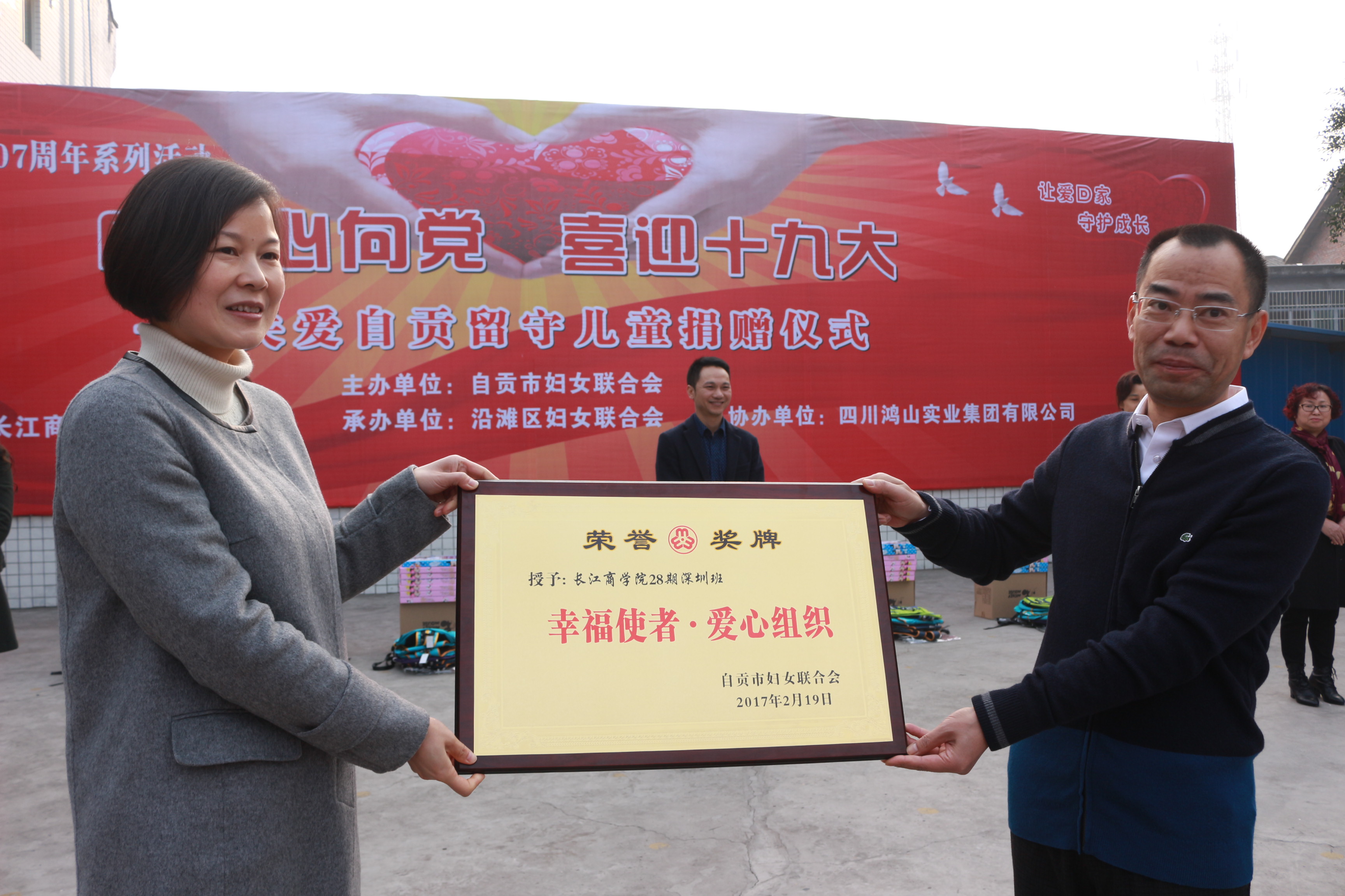 四川鸿山集团董事长陈祥平代表长江EMBA28期5班全体学员,向自贡市妇联捐款20万元关爱留守儿童项目专项资金,自贡市妇联主席沈焰林向长江EMBA28期5班授予“幸福使者·爱心组织”荣誉牌。