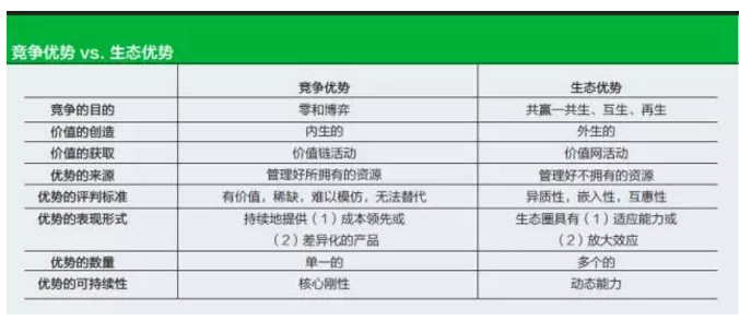 然而,构建或重构生态圈能否为企业带来持续的超额利润?它与竞争优势有什么关系:是“鱼与熊掌”,还是“缺一不可”?生态优势是否能够替代竞争优势?这些问题迫使我们今天重新思考企业优势的来源。
