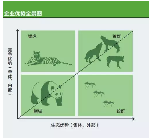 我们以“竞争优势”和“生态优势”为两个维度,可以勾画出不同企业的优势图谱。根据企业在图谱中的不同位置,可以区分为“熊猫”、“猛虎”、“蚁群”、“狼群”这四种类型。