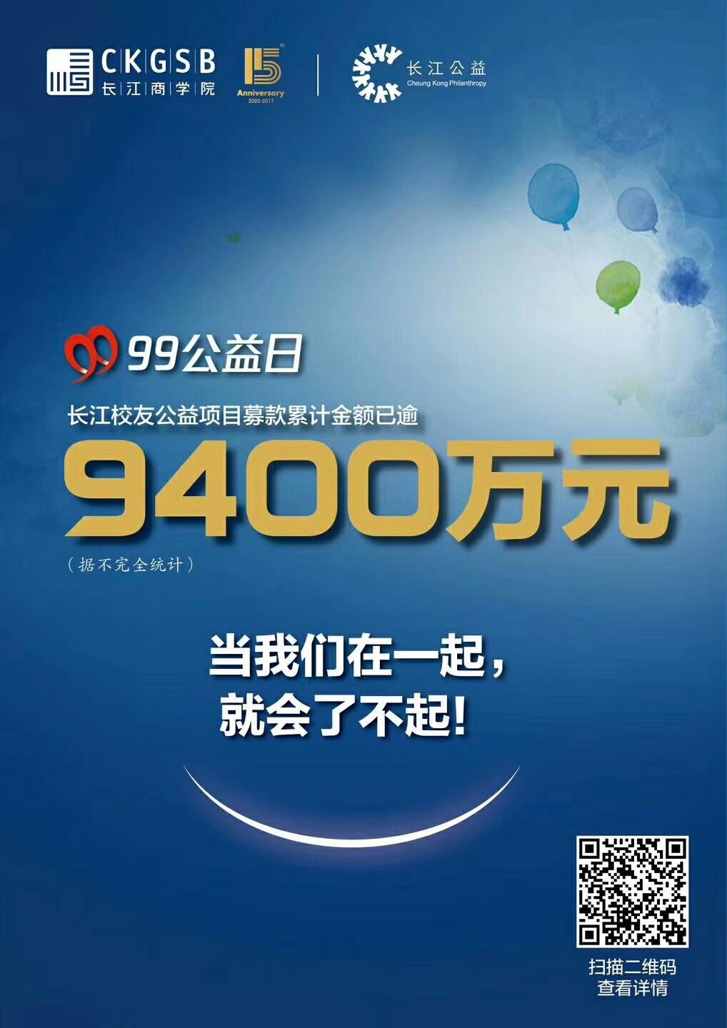 据统计,2017年“99公益日”3天筹款总额为13亿,长江校友公益项目总额为9400万,创历史新高!在长江校友们广泛社会影响力和号召力下,千万指尖共递爱心,“无公益 · 不长江”让互联网+与公益创新绽放更多光芒,照亮社会的每一个角落。