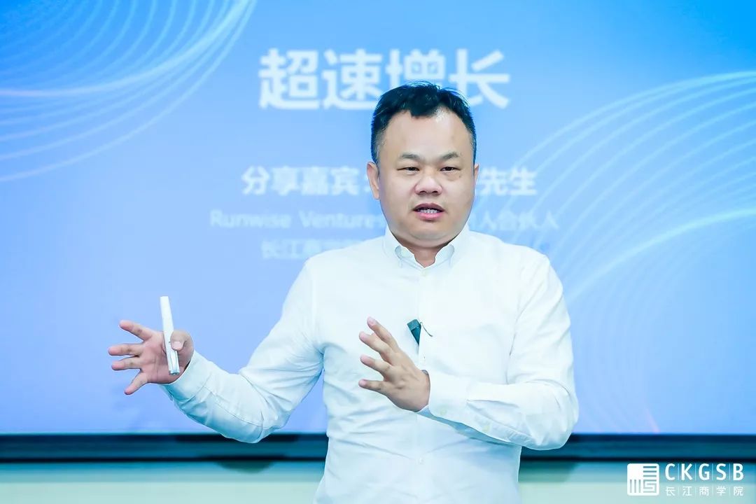 首先分享的是,Runwise Ventures 联合创始合伙人、长江商学院EMBA10期校友潘应兴先生。潘应兴先生回忆自己在长江就读的经历,他表示自己在长江深受同窗们企业家精神的感染,也由此引出分享的话题——企业的“超速增长”。