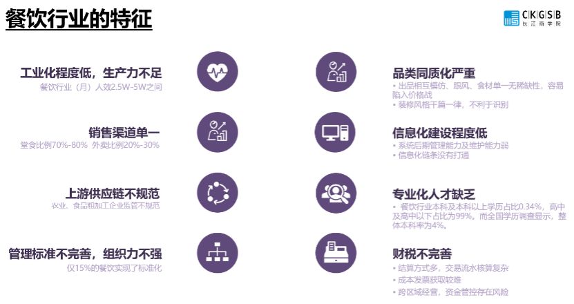 餐饮行业成为这次疫情的重灾区,在收入归零导致现金流危机的情况下,还要支付房租、人工工资,导致企业承受重大的负担。目前连锁餐饮行业的八大特征主要体现在: