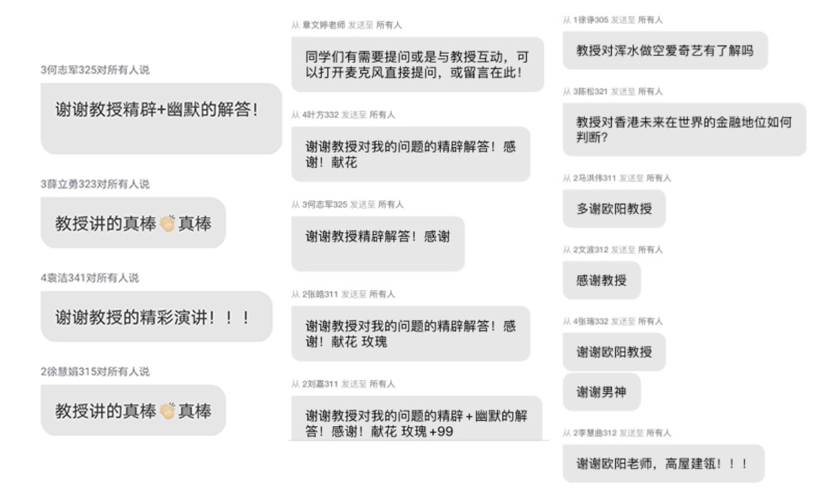 原定3个小时的课程,因为同学们热情高涨、积极提问,欧阳教授知无不言、精彩回答,足足4个小时才结束,大家对中国经济、中美金融市场的机遇有了更深的理解和认知,有同学评论“比在教室里听得还认真”。