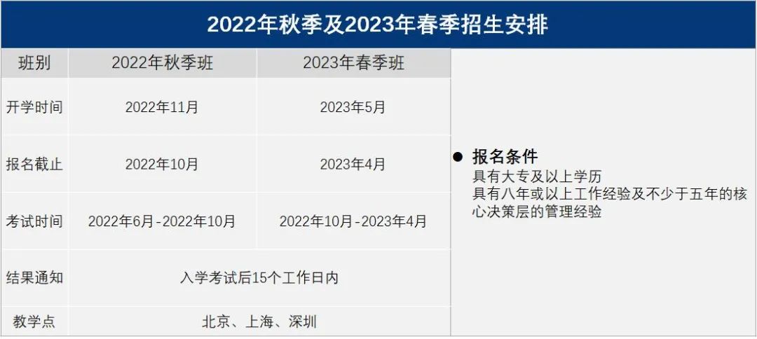 长江EMBA每年设两期,春季班5月开学,秋季班10月开学。采用全年滚动招生,除开学月外基本每月均设有面试,春季班申请截止到4月,秋季班申请截止到9月。(如遇疫情等不可抗力原因,开学时间或可能有所调整。)