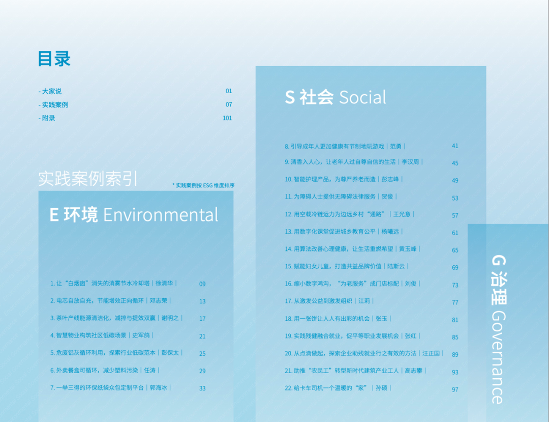 实践集的主角是22位学员带来的22个案例,用ESG维度分类展示,方便读者按图索骥。