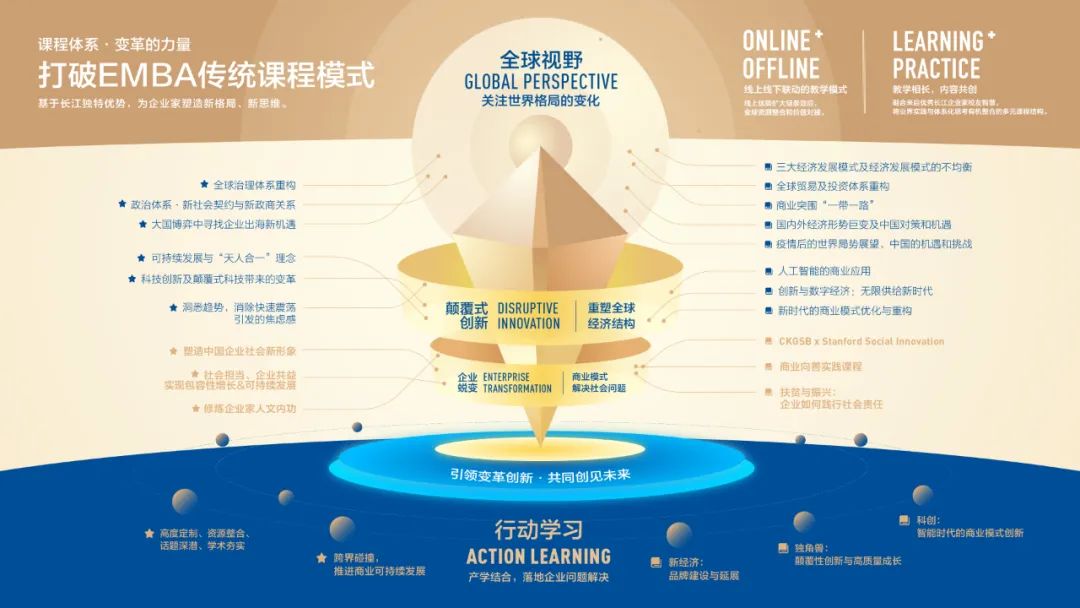 长江EMBA课程注重夯实企业核心管理能力的基础上,构建宏观视野与全球格局,并最终回归商业的本质。透视未来商业前沿,推动商业实践的发展进步。在这个整体框架下,我们会根据环境的变化、科技的发展、社会的进步以及商业范式的演进不断迭代具体的课程内容。
