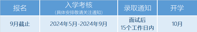 长江EMBA每年设两期,春季班5月开学,秋季班10月开学。采用全年滚动招生,除开学月外基本每月均设有面试,春季班申请截止到4月,秋季班申请截止到9月。