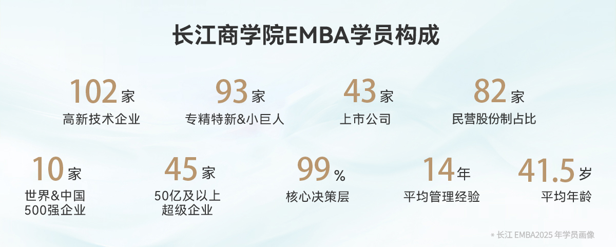 长江商学院EMBA项目以“培养现代企业管理创新力、实践力与影响力的企业家”为己任,历经发展已经成为中国及大中华地区受尊敬企业的高层管理人员系统学习管理知识之优选。长江商学院EMBA目前拥有遍布全国及世界各地的全球校友网络,为校友搭建了具有相当影响力与价值的全球精英学习交流平台。 自2002年11月至今,长江商学院EMBA已招收13000余位来自各行各业的海内外精英。相较于其他商学院,长江商学院EMBA学员的高端性及广泛代表性呈现出以下特点: