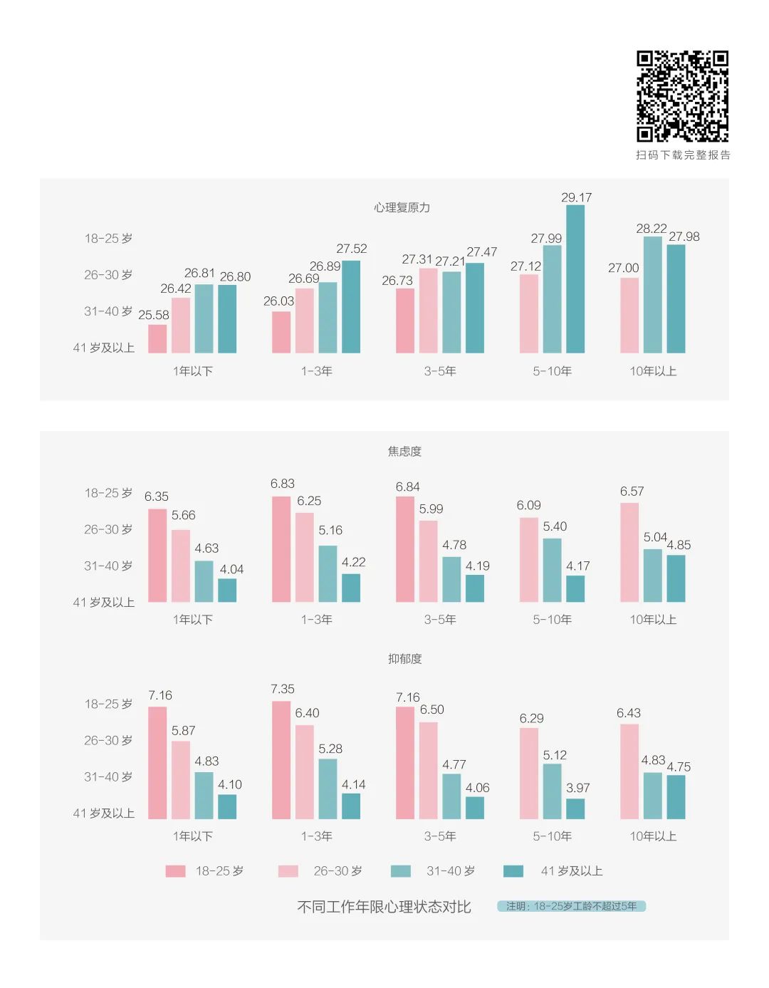 我们回收了上万份问卷的分析结果显示,Z世代在各职级和各工作时限的心理复原力都是最低的,而焦虑和抑郁度水平都是最高的。