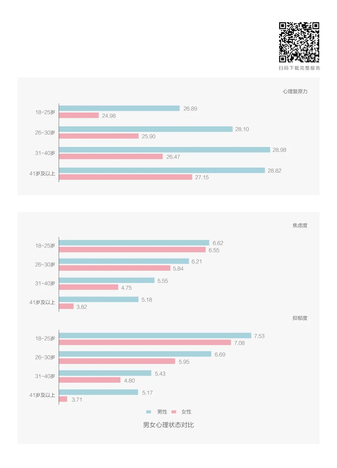 其中,Z世代群体的男女心理复原力均为最低水平(男性为26.89,女性为24.98),而抑郁度(男性为7.53,女性为7.08)和焦虑度(男性为6.62,女性为6.55)水平最高。