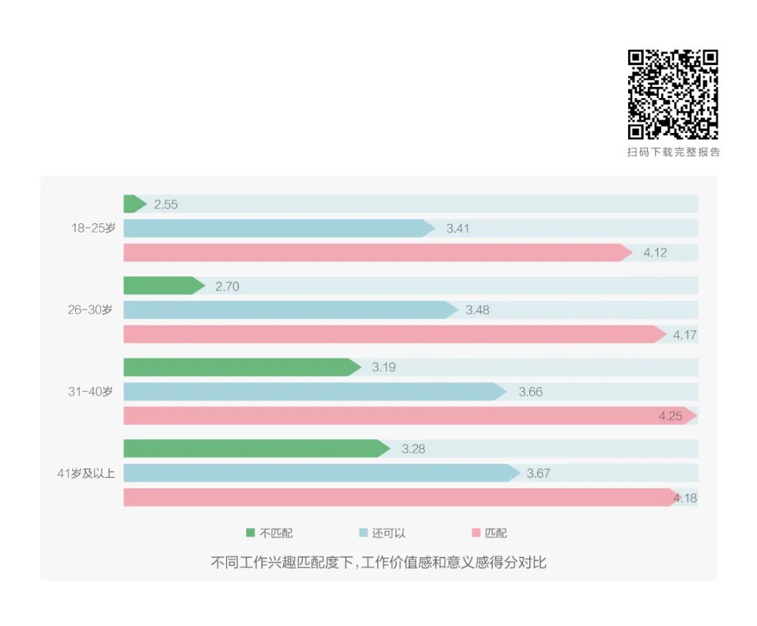 同时我们发现,工作兴趣匹配度与年龄确实呈正相关关系。Z世代职场人工作和兴趣的匹配程度最低,但随着年龄的增加,工作和兴趣的匹配度呈现上升趋势。