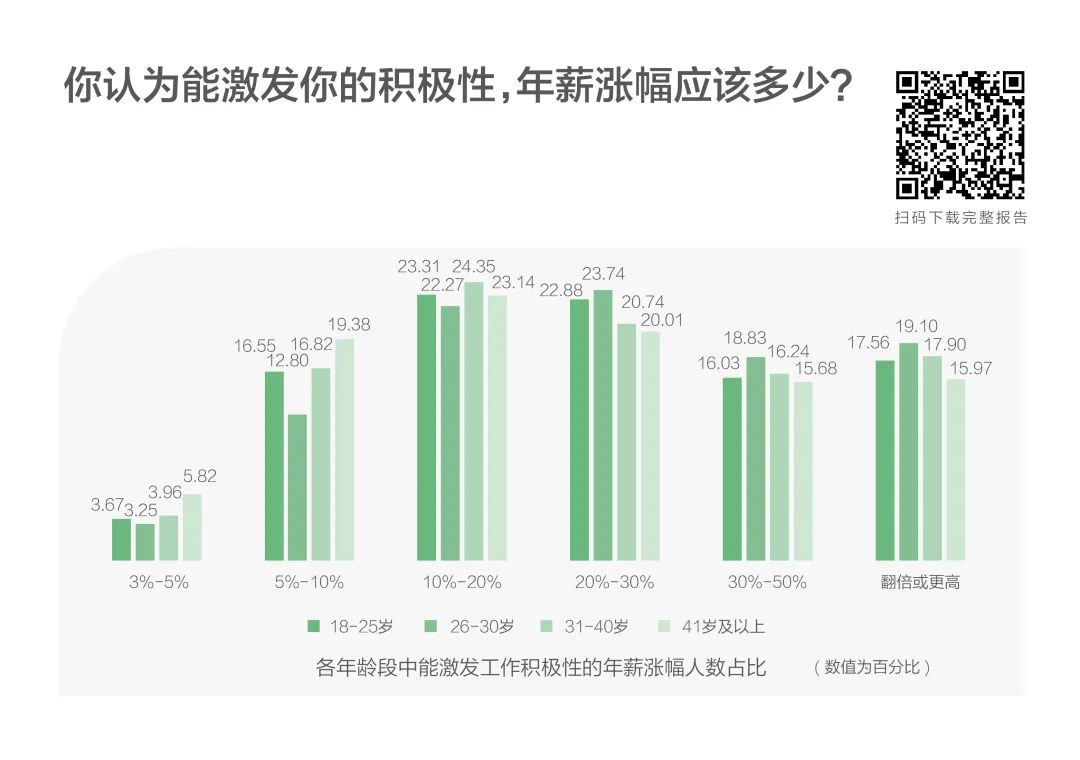 我们的调研数据显示,10-20%的年薪涨幅是跨代际的共同期待(人数占比最高),每年3%-5%的普涨对任何年龄段都没有明显的激励作用。