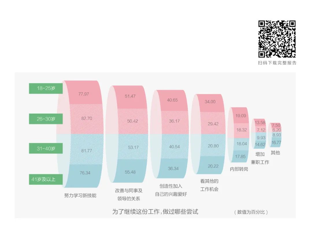 整体来看,无论是什么年龄的群体,为了继续当前的工作,都会优先选择“努力学习新技能”“改善与同事及领导的关系”以及“创造性加入自己的兴趣爱好”。