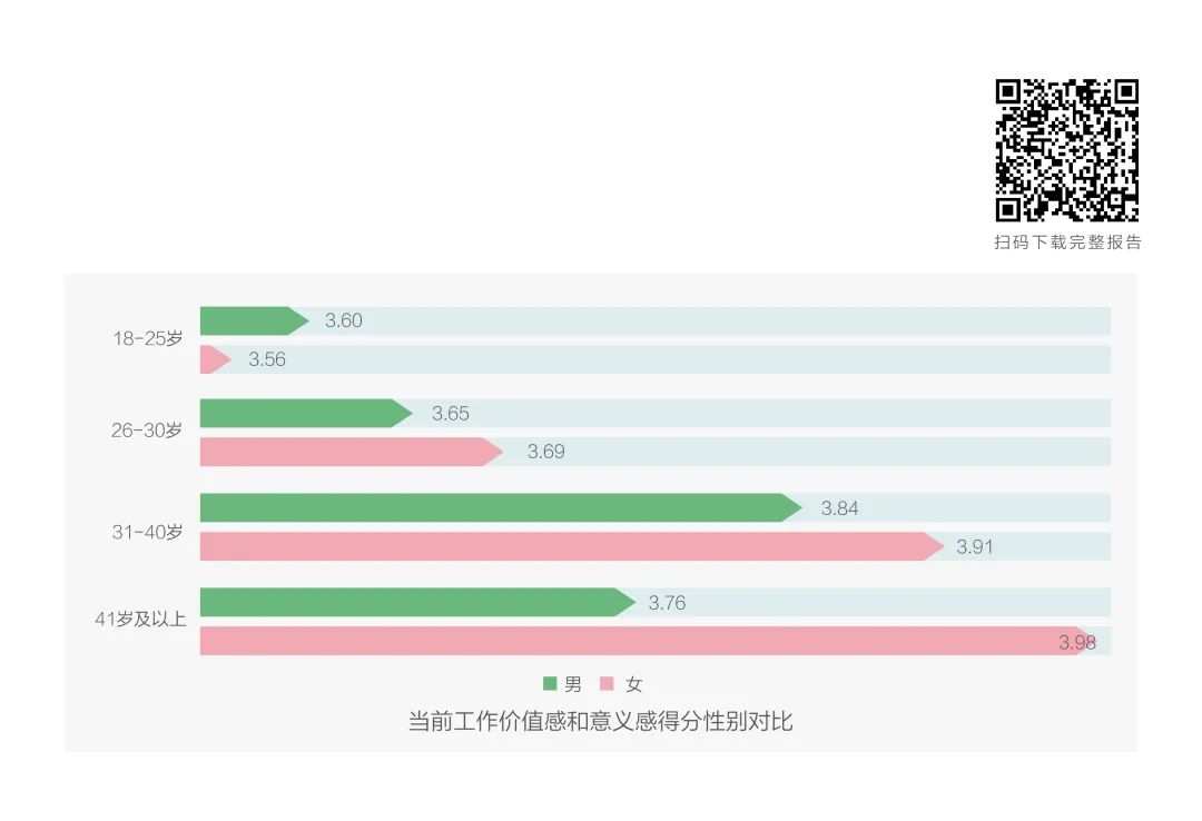 分年龄段来看,Z世代对当前工作的价值感和意义感相对较弱,且女性得分(3.56)比男性(3.60)的更低,其他年龄段与我们的整体样本分析情况一致,说明女性随着年龄的增长,能够更为有效地做出调整并找到工作中的意义感和价值感。