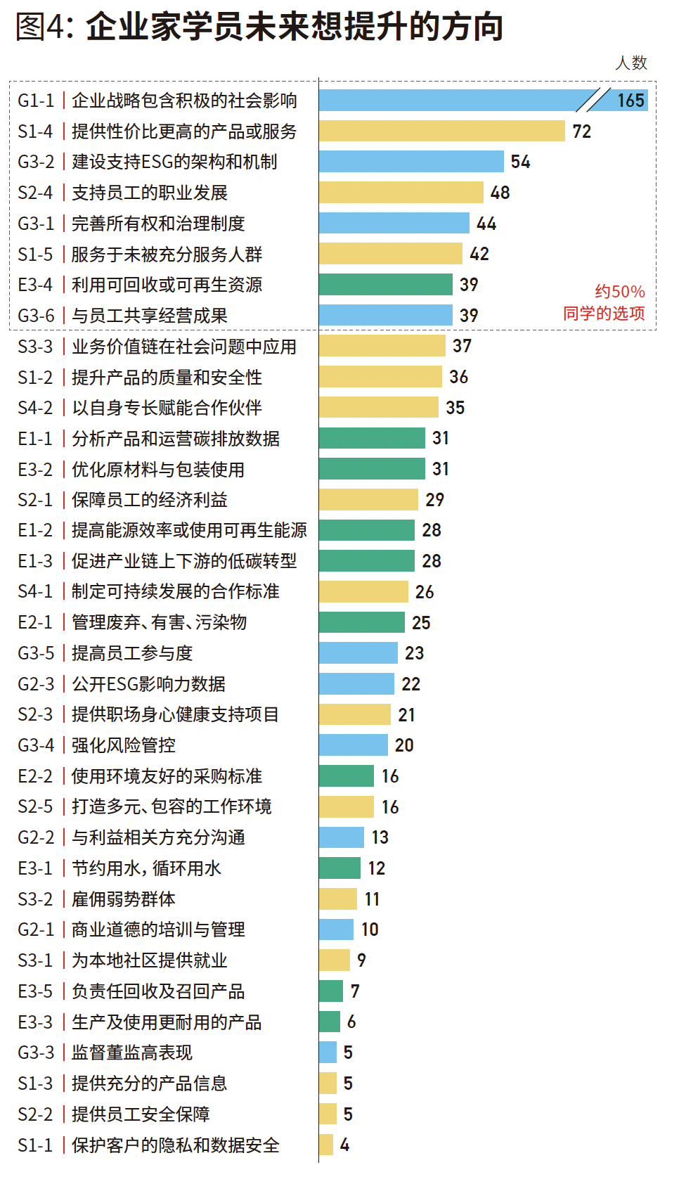 这组数据颇具启示意义:165名学员(占比16%)一致选择G1-1议题(企业战略包含积极社会影响),表明他们计划重新审视企业愿景、使命与价值观,强化其中的社会价值与利他精神。紧随其后的热门选项包括提供高性价比产品服务、构建ESG支持架构等。