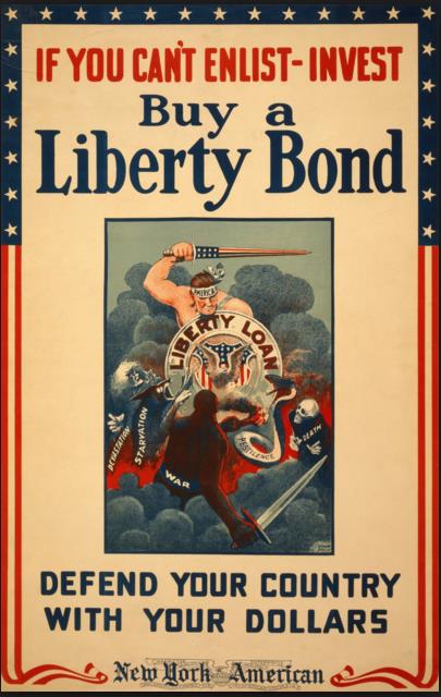 在第一次世界大战期间,世界上很多国家都通过战争债券(War Bond)的形式进行融资。美国发行的债券名称叫做自由债券(Liberty Bonds)。当时流行的一句广告词是:“如果你不能参军打仗的话,请购买自由债券(If you can’t enlist, invest. Buy a liberty bond)”。著名的喜剧大师卓别林先生还自拍自演了一部短片叫“The Bond”(Bond在英文中的另外一个意思是纽带)来宣传和推广战争债。 美国的第一批自由债在1917年发行,以票面利率3.5% 筹集了50亿美金。在第二次世界大战期间,战争债再次发行。到目前为止在英国,为一战融资的永续债券(Consols)仍有部分在市面上流通。
