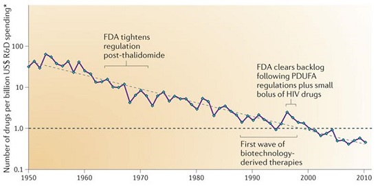 来源:Scannell, et. al. 2012. Nature Reviews Drug Discovery 11, 191-200.