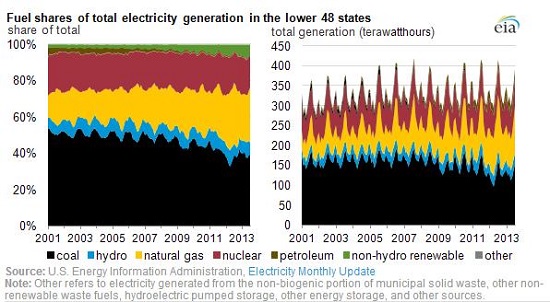 在过去的30年里,美国的空气污染物降低了一半以上,同时,工业生产总值却提高了约40%。著名的迈克尔波特教授(Michael Porter)一直宣扬这样的观点:“严厉的环境保护法规会促进企业不断的创新和升级,并提高生产率”,这也被称为“Porter Hypothesis”。 下图中,这些年来的核能和天然气在发电中的广泛应用可视为证据。