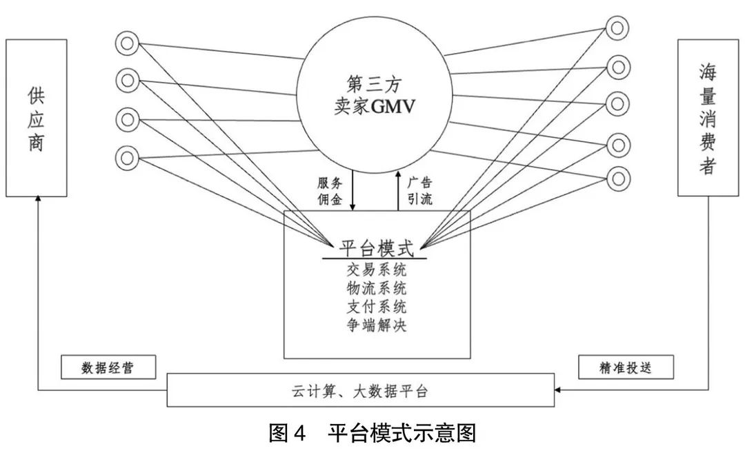 图4是平台模式示意图,以阿里为代表。那么,平台模式与前述直营模式有什么差别呢?单纯从图上来看,平台模式与直营模式一样,也有交易系统、物流系统、支付系统和争端解决系统。但重点是它通过向第三方商家提供销售服务并收取广告费和佣金,而不是自己直接经营商品。