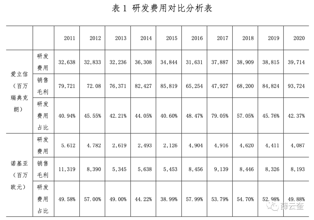 爱立信或许是华为竞争者中最“努力”的一家公司。其产品和服务虽然在全球范围内得到广泛认同,但业绩增长却缺乏动力。公司持续追加研发投入,却无奈何始终没有创新出像样的技术和产品。2020年投入研发经费397亿瑞典克朗,约合293亿元人民币,如表1所示,占销售毛利的42.37%;过去10年累计投入研发经费3,558亿瑞典克朗,平均占同期销售毛利的47.04%。公司在激烈竞争条件下获取的微薄毛利几乎近一半投入到研发,但却仍然未能赢得大的起色,可见行业竞争的激烈程度,其中一个很重要的原因很可能是手机经营上的失败所致。