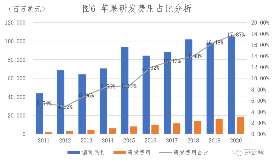 2020财年苹果投入研发经费188亿美元,较上年162亿美元增长15.63%。过去10年增长6.72倍,复合增长率25.49%。10年间累计投入研发经费952亿美元,占同期销售毛利的11.63%。是上述所有公司中研发投入占比最低的公司。这一方面是因为苹果在规模尚小的时候依赖乔布斯这个产品创新天才,以很少的研发投入取得了巨大的业绩回报;另一方面,也是因为苹果目前的毛利体量太大,如果按20%销售毛利计提研发费用,2020年将会超过200亿美元。刻意地投入有时也会是一种“拔苗助长”。但从图6可以看到,苹果的研发投入在逐年加大。