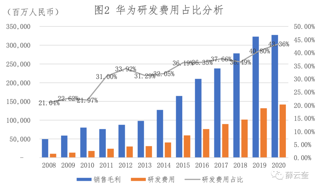 研发投入1,419亿元人民币,如图2所示,占销售毛利的43.36%。过去10年累计投入研发经费7,257亿元人民币,占同期销售毛利的37.59%。研发投入经费的复合增长率高达22%,远快于公司销售收入与净利润增长,表明华为对研发活动的重视程度超过对销售和利润增长的关心,尤其是过去三年,华为面对美国制裁更是进一步加大了研发投入的力度,研发投入占销售毛利的比重从2018年的36.49%升高至2020年的43.36%。华为早在2012年便提出:“把握行业转型的机会,敢于加大投入,抢占战略机会点;以有效的增长为核心,有舍有弃地加强战略集中度,把握战略制高点,构筑公司面向未来长期生存发展的基础。”[5]