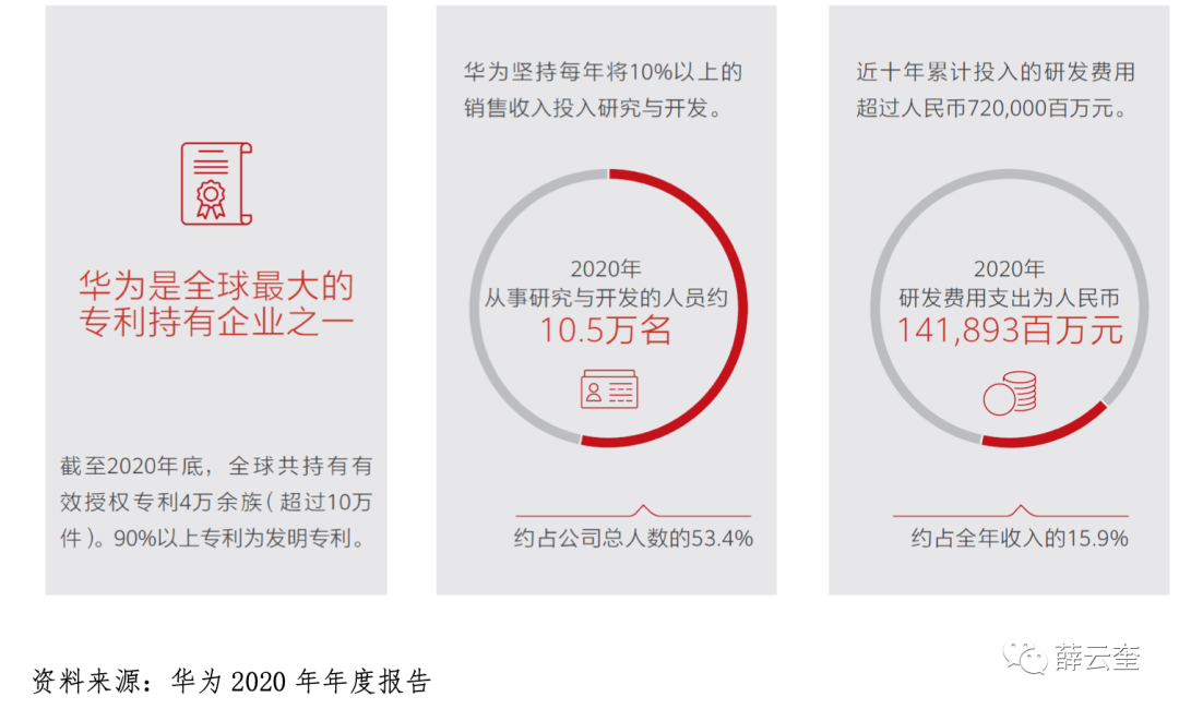 根据华为2020年年报,如图1所示,华为19.7万名员工中从事研发的员工数量约为10.5万名,占员工总数的53.4%。创新是华为发展的不竭动力,任正非说:“技术的领先带来了机会窗利润,我们再将积累的利润投入升级换代产品的研究开发,如此周而复始,不断地改进和创新” [4]。