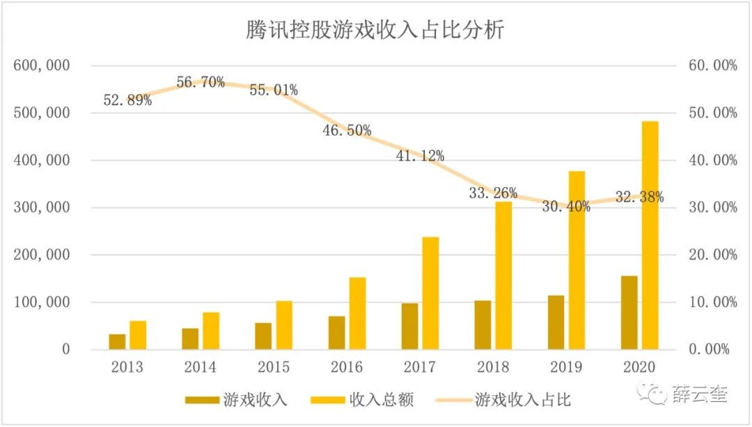 腾讯2020年销售总收入4,820亿元人民币,其公开披露的游戏服务收入为1,561亿元,占总收入的32.38%。由此可知,腾讯游戏收入尚不足其总收入的三分之一。从经营层面来看,它的销售总收入具有如下几个特点: