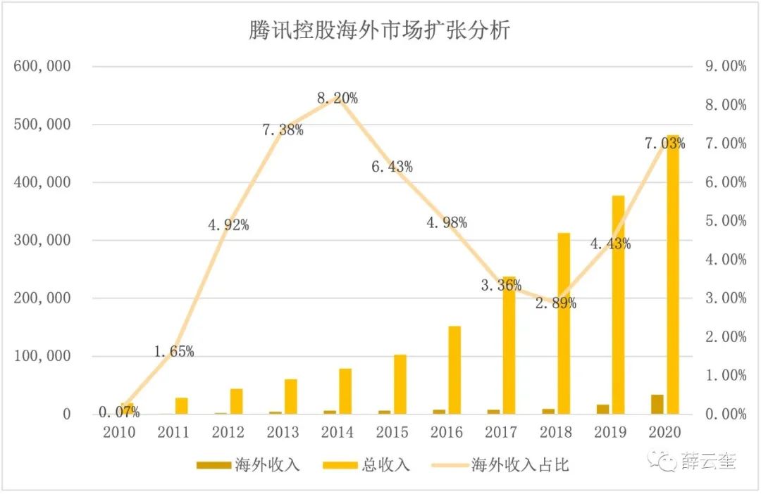 从下图可以看出,腾讯的国际化趋势曾经在2014年达到顶点,当年海外销售收入占比达到总收入的8.2%,而且,在此之前保持了快速的上升趋势。但在2015年及之后,则开始走下坡路,变得越来越本土化。过去三年,这一占比又开始提升,表明腾讯在过去三年又加大了全球化经营的布局。截止2020年度末,海外经营性资产规模已达2,425亿元人民币,超过了经营性总资产的三分之一(37.74%),只是海外经营性资产布局尚未发挥出与国内同类资产的同等效率。