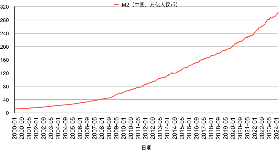 中国M2是衡量广义货币供应量的指标,包括了流通中的现金、单位存款、个人存款以及其他可转换为现金的存款。图表1是2000年至2024年中国M2规模。其中,2013年3月,中国M2规模首次突破100万亿元,耗时63年6个月(自1949年10月算起);2020年1月,M2突破200万亿元,耗时6年10个月;2024年3月,M2突破300万亿元,耗时4年2个月,最新值为304.80万亿。