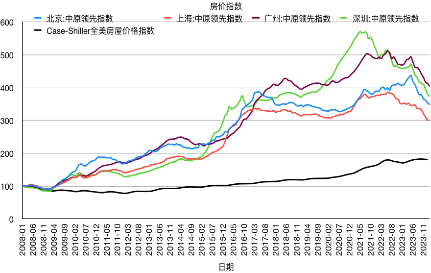 图表16:2008年初至2024年2月中国一线城市和美国房屋价格指数对比(2018年1月=100)