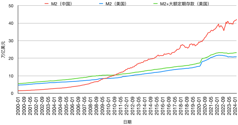 图表3:2000年1月至2024年2月中国和美国M2规模对比