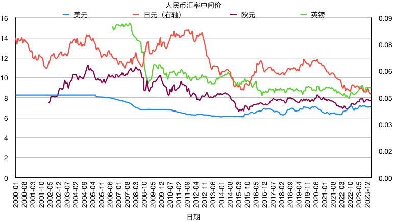图表15:2000-2024年3月人民币对美元、日元、欧元和英镑的汇率中间价