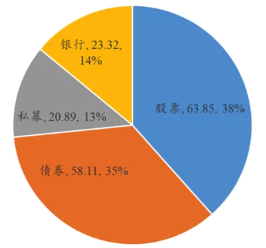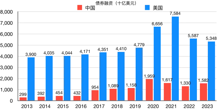 图表12是2013年至2023年中国和美国债券融资对比。中国债券发行量小于美国。中国债券(政府债和企业债)发行量小于美国债券(国债、公司债、市政债)发行量。2023年,中国债券发行1.58万亿美元,是美国债券发行(5.35万亿美元)的30%。