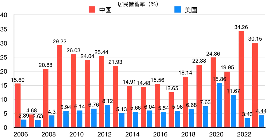 图表9:2006-2023年中国和美国居民储蓄率对比